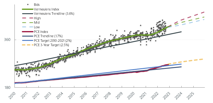 Vermeulens Index tracks bid prices for nonresidential construction projects relative to the average represented by Vermeulens Trendline. Personal Consumption Expenditures Index tracks general prices relative to PCE Trendline and PCE Target. Strength in nonresidential construction point to short term cost increases of 0.75% per month, and a continuing increase in the long term Vermeulens Trendline toward 4%.